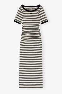 This Striped Soft Cotton Rib Short Sleeve Dress features a round neckline, short sleeves with ribbed edges, a GANNI Butterfly logo, ruched detailing on the bodice and side slits. DETAILS - 95% organic cotton, 5% elastane. Learn more about our materials - Round neckline - Short sleeves - Side slits - Ribbed edges - GANNI Butterfly logo - Ruched detailing on the sides Made in: Portugal Product ID: T4147 SIZE & FIT - Elvina is 5’11” and wears a size S