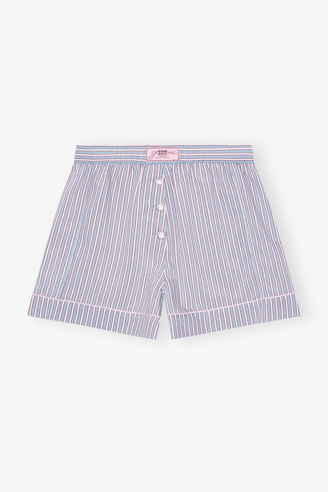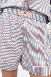 These Striped Yarn Dyed Elasticated Shorts feature an elastic waistband with a GANNI logo patch, a button closure at the front and a back pocket. DETAILS - 81% LENZING™ ECOVERO™ viscose, 19% polyamide. Learn more about our materials - Button closure at the front - Back pocket - Elastic waistband with GANNI logos Made in: India Product ID: W0388 SIZE & FIT - Denise is 5’9” and wears a size US 4
