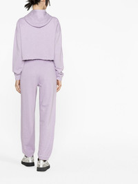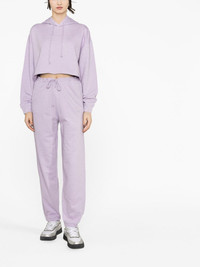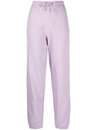 tapered organic cotton track pants GANNI injects these track pants from the AW23 collection with its signature Scandinavian style. Crafted from soft organic cotton, the lilac-hued pair sits high on the waist and falls to a tapered leg. Highlights - Lilac purple - Organic cotton - Elasticated drawstring waistband - Two side slit pockets - Ribbed cuffs Imported Composition Organic Cotton 100% SIZE & FIT Model measurements Height 5 ft 10 in(1.77 m) Bust/Chest 31.49 in(80 cm) Hips 35.03 in(89 cm) Waist 23.22 in(59 cm) FittingInformation Designed for a relaxed tapered cut, these trousers allow for a close fit at the waist and offer a loose fit at the thighs, with a closer fit toward the ankles Adjust this piece’s waistband to your preference using the drawstring Made from a midweight non-stretch fabric, this piece offers minimal elasticity when worn This piece fits true to size – take your usual size Washing instructions Machine Wash