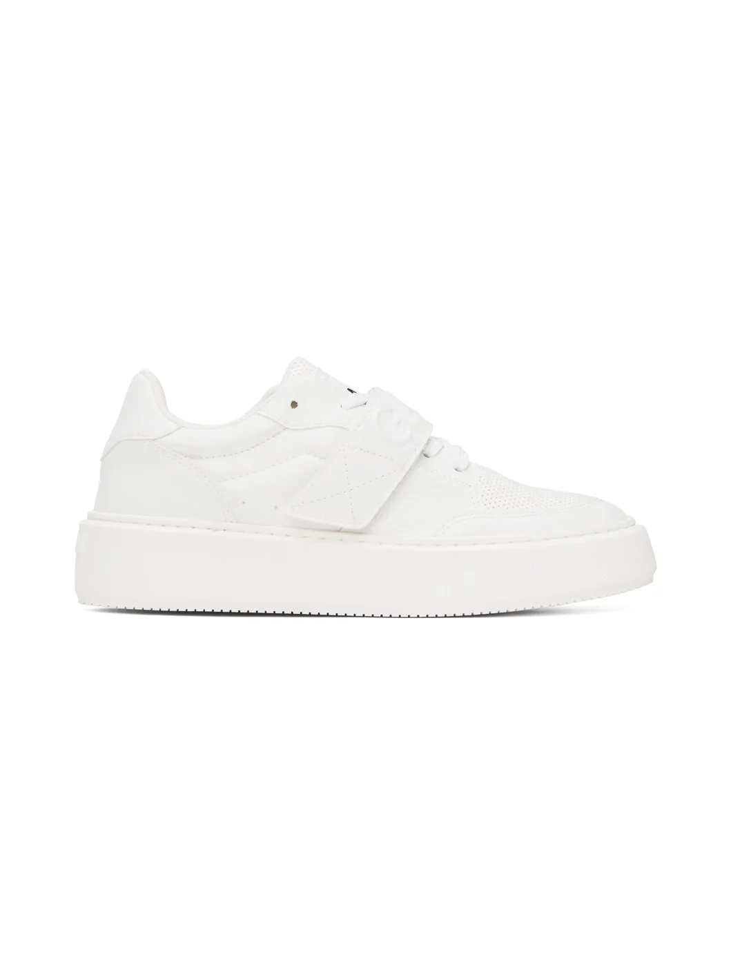 Low-top paneled buffed faux leather sneakers in white. Perforated detailing throughout. · Logo-embossed velcro strap at lace-up closure · Textile logo patch at padded tongue · Padded collar · Mesh lining · Treaded rubber sole · Platform: 1.5 in Supplier color: White Upper: synthetic. Sole: rubber. Made in Portugal 231144F128001
