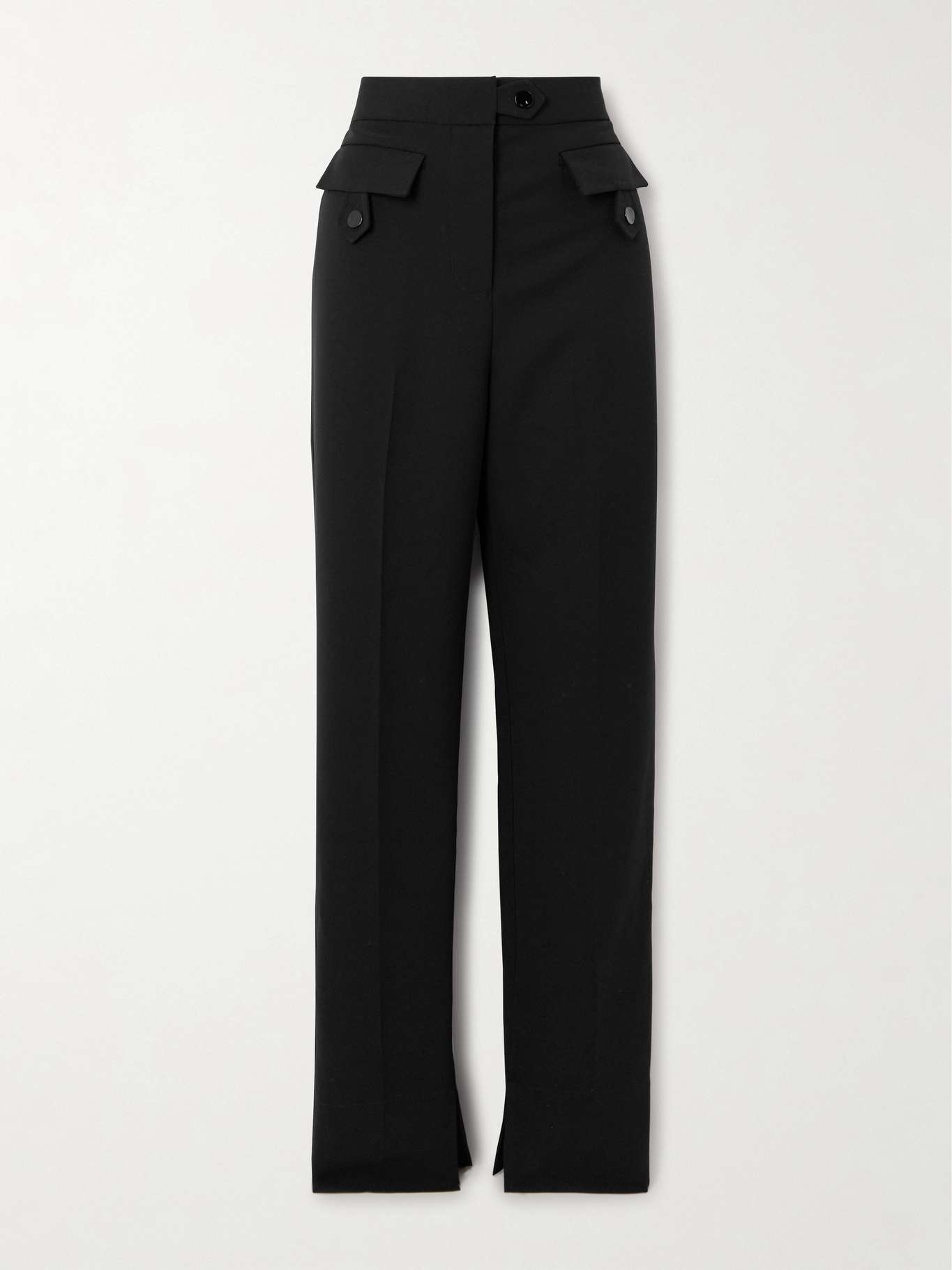EDITORS'NOTES GANNI's pants are tailored from organic cotton-blend twill with 27% recycled fibers. They have a high-rise waist with flap pockets that give them a subtle peplum look. The straight legs are split at the cuffs, so they fit nicely over mules or sneakers. SIZE & FIT Model measurements: - Fits true to size, take your normal size - High-rise, designed for a straight-leg fit - Mid-weight, non-stretchy fabric - Model is 177cm/ 5'10" and is wearing an EU 34 - Bust: 81cm/ 32" - Waist: 65cm/ 25.5" - Hip: 92cm/ 36" DETAILS & CARE - Black organic cotton-blend twill - Concealed button, hook and zip fastening at front - 63% organic cotton, 27% recycled polyester, 10% polyester