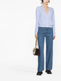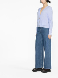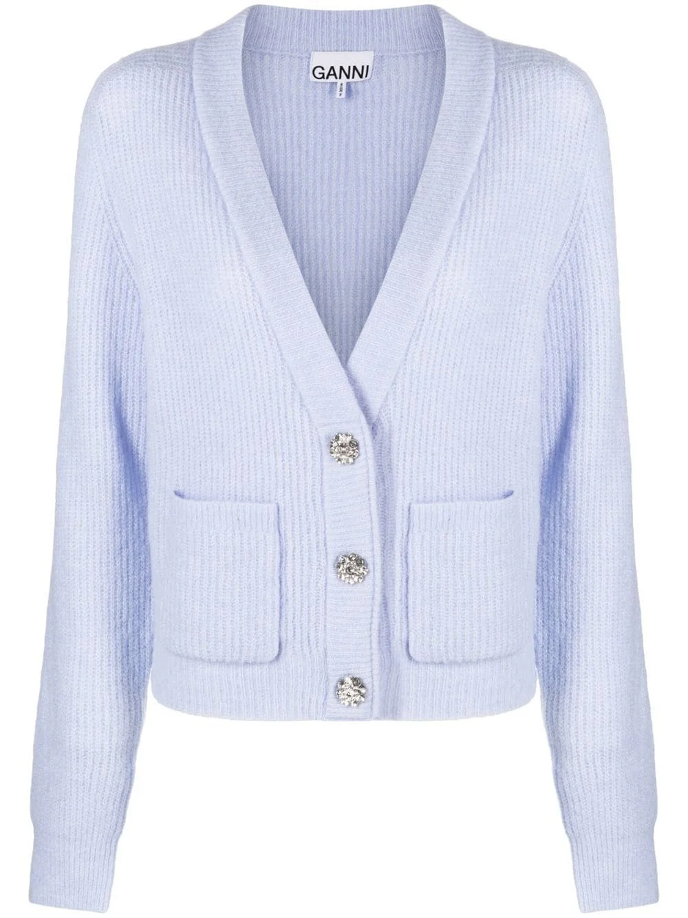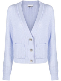 V-neck cardigan Colourful yet minimal knitwear is a GANNI signature. This cardigan reflects that, with its classic V-neck silhouette allowing the sky blue hue to take focus. Highlights - Blue - Alpaca wool-blend - V-neck - Front button fastening - Long sleeves Imported Composition Merino 32%, Alpaca Wool 32%, Polyamide 30%, Spandex/Elastane 6% SIZE & FIT Model measurements Height 5 ft 10 in(1.77 m) Bust/Chest 31.49 in(80 cm) Hips 35.03 in(89 cm) Waist 23.22 in(59 cm) FittingInformation This piece fits true to size. We recommend you get your regular size Cut for a relaxed fit Made with a mid-weight stretch fabric Measurement LENGTH 18.5 in(47 cm) BUST 36.22 in(92 cm) Washing instructions Hand Wash