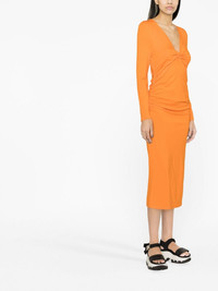 V-neck long-sleeve dress Ganni's contemporary approach to minimalist style is showcased on this long-sleeve dress from the SS23 collection, through its monochromatic hue and gathered detailing. Highlights - Orange - V-neck - Gathered detailing - Long sleeves Imported Composition Lyocell 96%, Elastane 4% SIZE & FIT Model measurements Height 5 ft 10 in(1.77 m) Bust/Chest 32.67 in(83 cm) Hips 35.43 in(90 cm) Waist 23.62 in(60 cm) FittingInformation Designed for a close fit throughout Made from a midweight stretch fabric, this piece offers elasticity and flexibility when worn This piece fits true to size – take your usual size Washing instructions Machine Wash