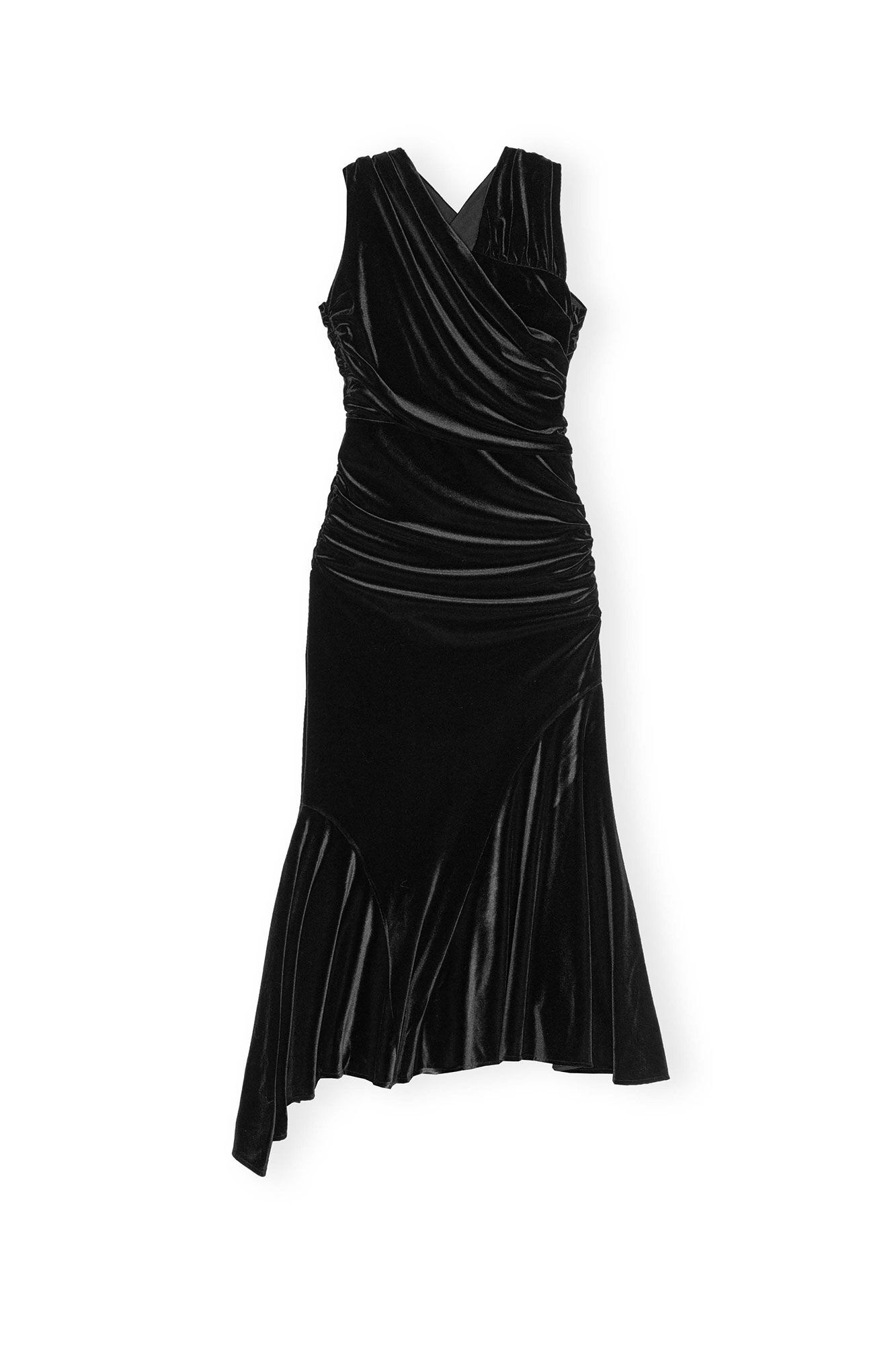 This Black Velvet Ruched Dress is sleeveless featuring a ruched, wrap-style design. The dress has a V-neckline with gathered pleating at the shoulders and a wrap design with a crisscross detail on the back. DETAILS - 94% recycled polyester, 6% spandex. Learn more about our materials - V-neckline - Sleeveless - Open back - Ruched detailing on the sides Made in: China Product ID: T4102 SIZE & FIT - Slim fit - Zoey is 5’10” and wears a size S