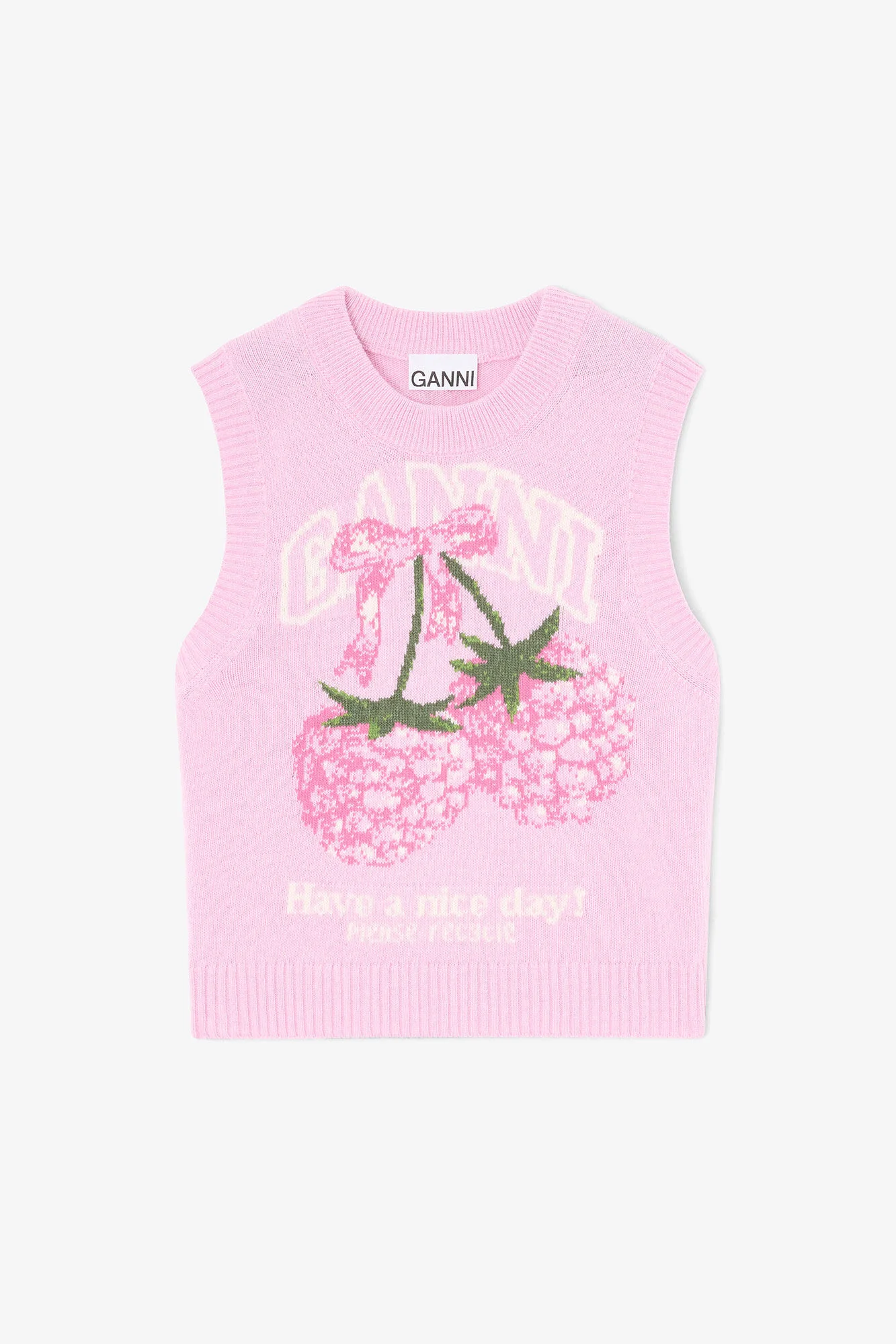This wool vest features a round neckline, ribbed edges, a raspberry print graphic and a 'Have a nice day! Please recycle' message. DETAILS - 45% Wool, 35% Recycled Wool, 20% Recycled Polyamide Learn more about our materials - Jacquard - Round neckline - Sleeveless - Ribbed edges - Raspberry print graphic - GANNI logo - 'Have a nice day! Please recycle' message Made in: Moldova Product ID: A1070278 SIZE & FIT - Regular fit