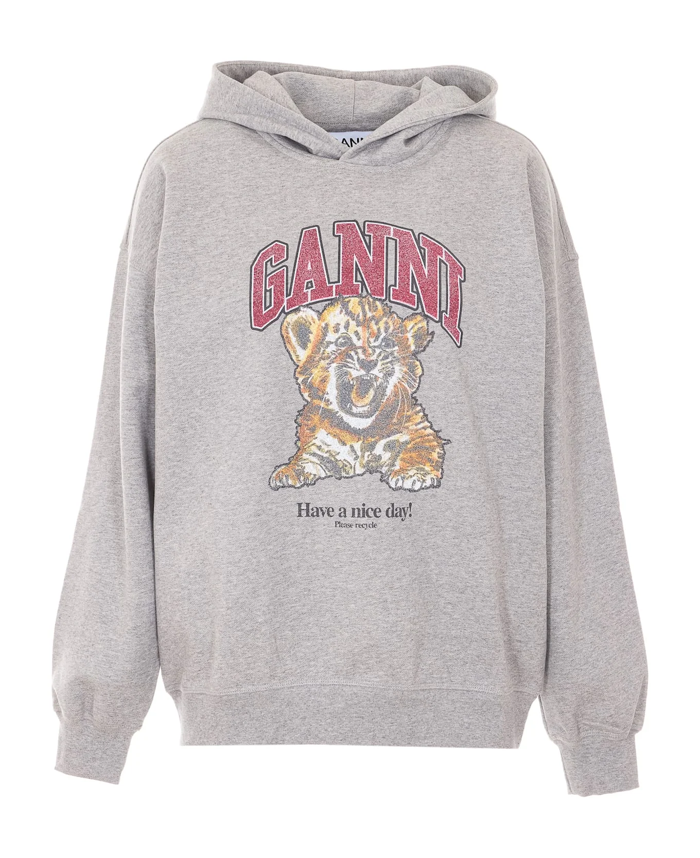 Ganni grey Isoli hoodie, print logo on the front, long sleeves, hood detail Composition: 100% Organic Cotton, 95% Organic Cotton, 5% Elastane Made in: Portugal Color: Grey Size and fit: - US SIZE Model number: A1060024920