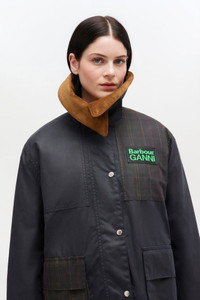 Inspired by a barn jacket, this GANNI x Barbour jacket features a detachable hood, a large collar, and a two-way zip closure. It includes patch and side pockets and is finished with a GANNI x Barbour logo patch. DETAILS - 100% cotton Learn more about our materials - Patchwork design - Detachable hood with adjustable drawstrings - Large courderoy collar - Button closure - Concealed two-way zip closure - Windstopper sleeves with elbow patches - Pockets: 2 side pockets, 2 patch pockets - Pleat at back - Tartan detailing - Hardware: Silver - GANNI x Barbour logo patch - Tartan lining Made in: Moldova Product ID: W0945 SIZE & FIT - Regular fit