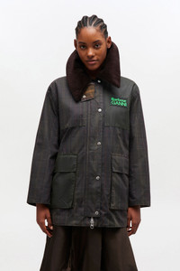 Crafted from waxed cotton, this GANNI x Barbour jacket features a detachable hood, a large collar, and a two-way zip closure. It includes four pockets, a pleat on the back, and is finished with a GANNI x Barbour logo patch. DETAILS - 100% cotton Learn more about our materials - Patchwork design - Detachable hood with adjustable drawstrings - Large courderoy collar - Button closure - Concealed two-way zip closure - Windstopper sleeves with elbow patches - Pockets: 2 side pockets, 2 patch pockets - Pleat at back - Tartan detailing - Hardware: Silver - GANNI x Barbour logo - Tartan lining Made in: Moldova Product ID: W0944 SIZE & FIT - Regular fit