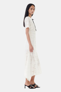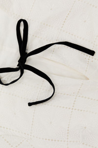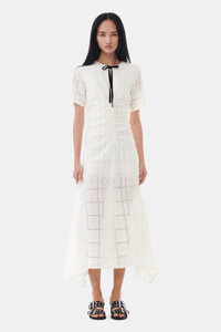 This White Broderie Anglaise Long Dress features a round neckline with an open front with a tie string, short sleeves and a flared skirt. DETAILS - 100% organic cotton. Learn more about our materials - Lining composition: 100% Organic Cotton - Round neckline - Short sleeves - Tie band - Flared skirt Made in: India Product ID: F9440 SIZE & FIT - Designed for a slim fit through the bust - Fits true to size, take your normal size - Mona is 5’9” and wears a size US 4