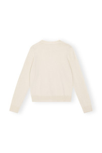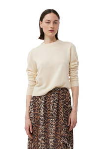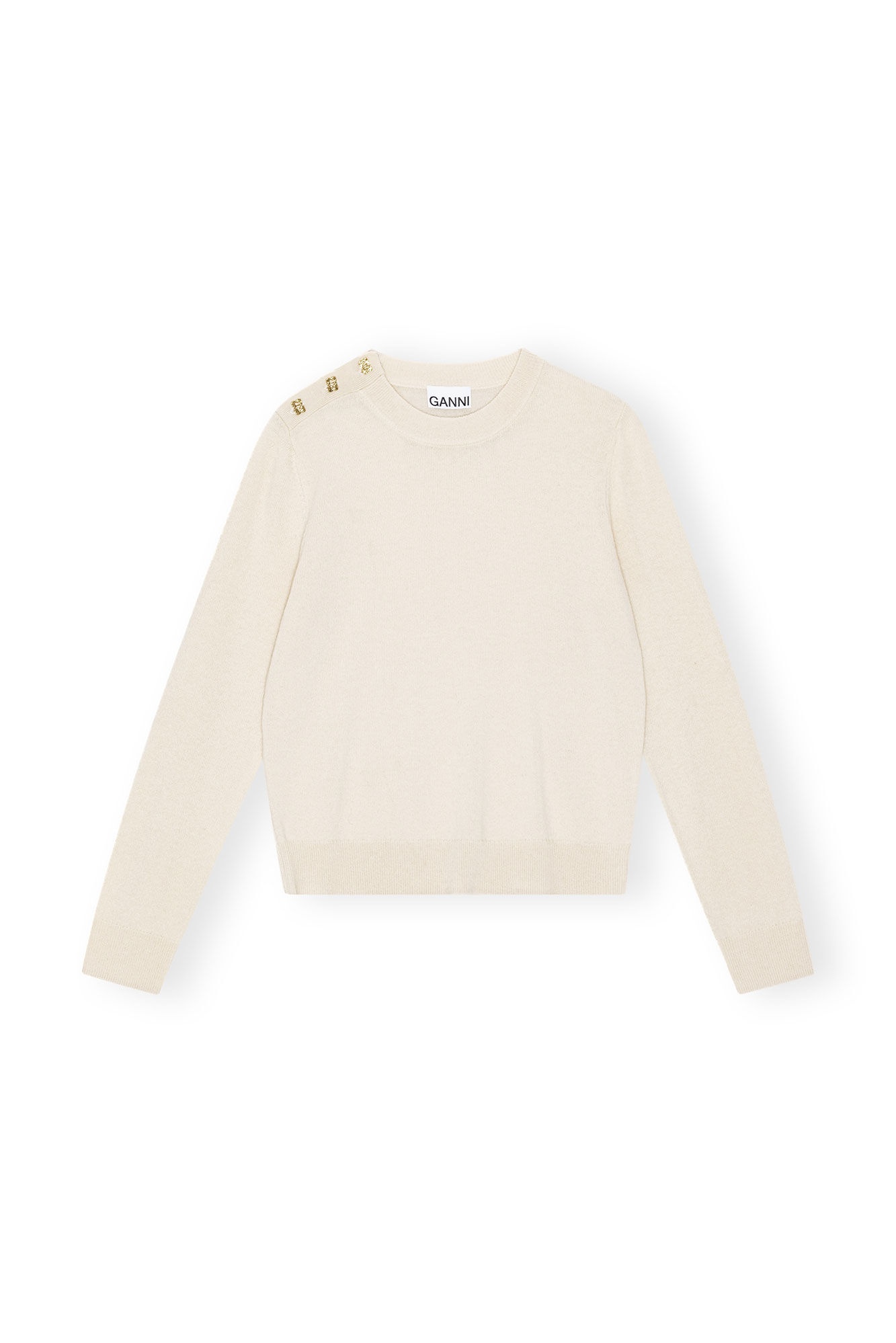 This White Cashmere Mix O-Neck Pullover is made from merino wool and cashmere. The pullover is designed for a regular fit and features a round neckline, long sleeves, ribbed edges and GANNI Butterfly buttons on the shoulder. DETAILS - 70% merino wool, 30% cashmere - Round neckline - Long sleeves - Ribbed edges - GANNI Butterfly buttons on the shoulder Made in: China Product ID: K2130 SIZE & FIT - Designed for a regular fit. Close over the shoulders - Fits true to size, take your normal size - Lightweight, soft fabric - Caroline is 5’9” and wears a size S