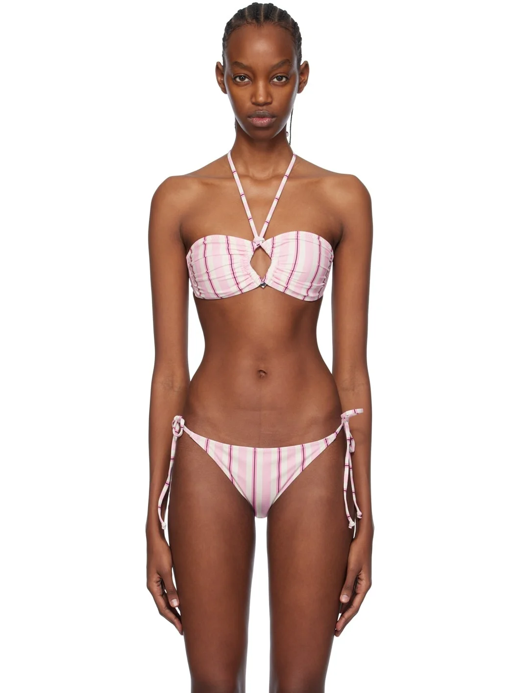 Stretch recycled nylon jersey bikini top. Stripes throughout. · Self-tie halter strap · Hardware cutout at padded cups · Tab-slot fastening at back Supplier color: Fiji flower Body: 78% recycled polyamide, 22% elastane. Lining: 84% recycled polyamide, 16% elastane. Made in Portugal 241144F105003