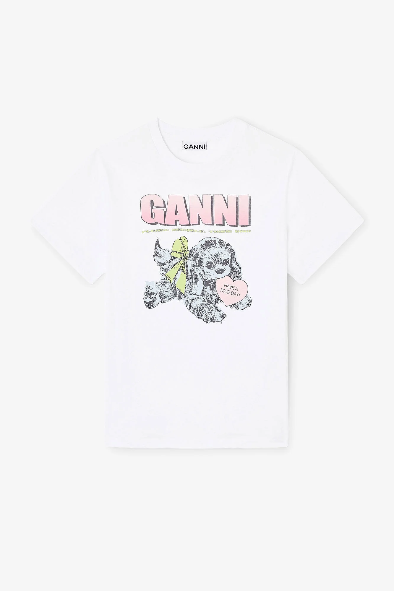 This T-shirt features a round neckline, short sleeves, and a GANNI logo. The T-shirt has a puppy print graphic and a 'Have a nice day! Please recycle' message. DETAILS - 100% organic cotton. Learn more about our materials - Round neckline - Short sleeves - Puppy print graphic - GANNI logo - 'Have a nice day! Please recycle' message Made in: Portugal Product ID: T4334 SIZE & FIT - Relaxed fit - Ayesha is 5’9” and wears a size S - For personalised guidance on sizing and fit, contact our Customer Service team - here - .