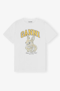 This White Relaxed Jersey Bunny T-shirt features a round neckline, short sleeves and a GANNI logo. DETAILS - 100% organic cotton. Learn more about our materials - Round neckline - Short sleeves - GANNI logo Made in: Portugal Product ID: T4273 SIZE & FIT - Relaxed fit - Yacine is 5’10” and wears a size US 4