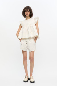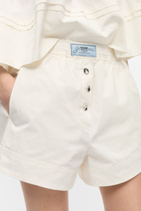 These White Stretch Cotton Elasticated Shorts feature an elasticated waist, a button closure and a ruffled hemline. DETAILS - 97% organic cotton, 3% elastane. Learn more about our materials - Button closure - Ruffled hemline - Elastic waist Made in: India Product ID: W0675 SIZE & FIT - Mariana is 5’10” and wears a size US 4