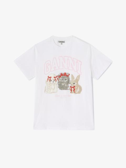 This T-shirt features a round neckline, short sleeves, and a GANNI logo. The T-shirt has a westen boot print graphic and a 'Have a nice day! Please recycle' message. DETAILS - 100% Organic Cotton Learn more about our materials - Round neckline - Short sleeves - 'Have a nice day! Please recycle' message Made in: Portugal Product ID: A1050075 SIZE & FIT - Regular fit - Lilli-zoe is 5’9” and wears a size S