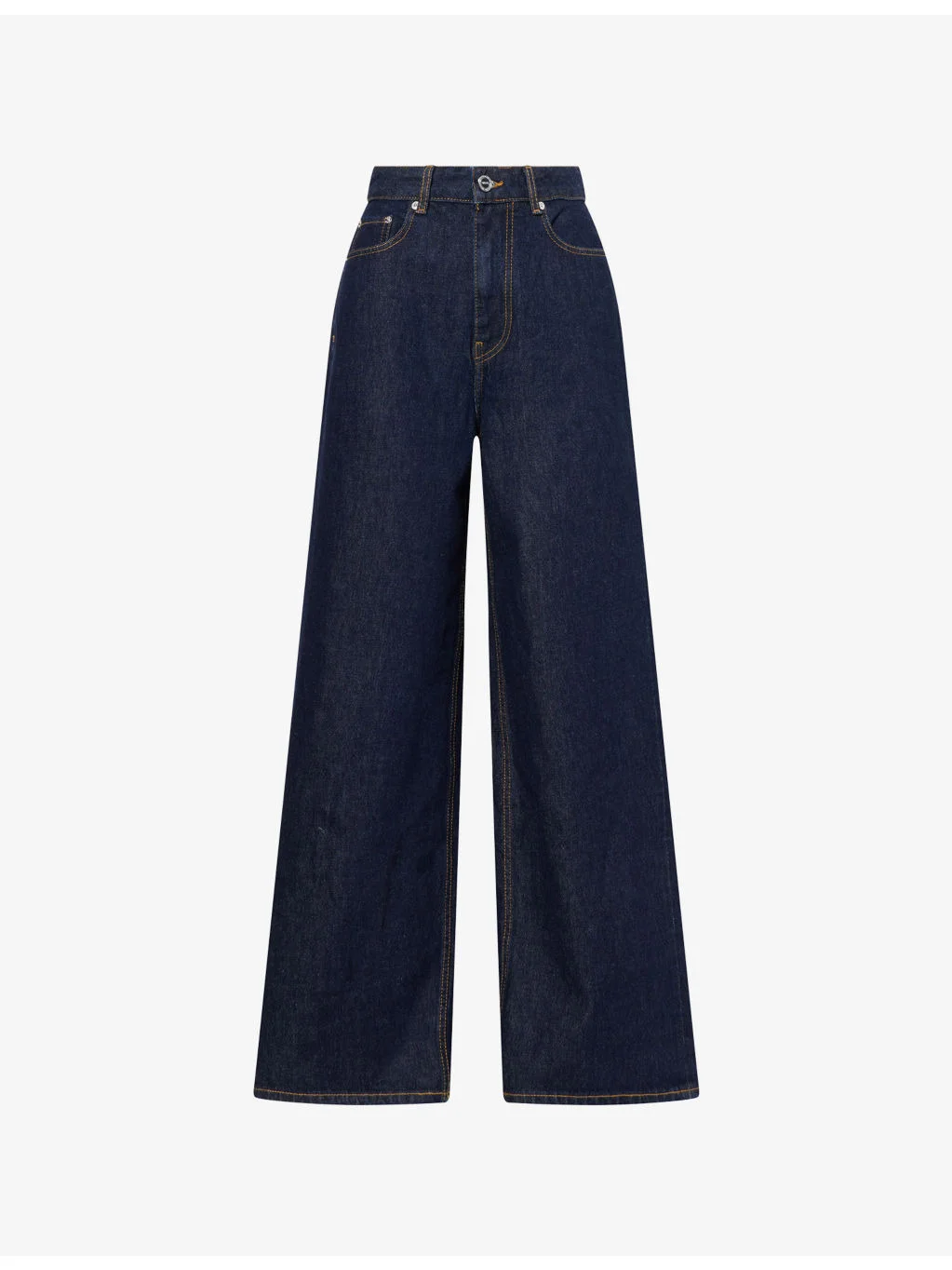 PRODUCT DETAILS - GANNI denim jeans - 100% cotton - Button and zip-fly fastening - Regular fit, mid-rise, straight wide leg, belt loops, five pockets, branded hardware, exposed stitching, brand patch at back - Machine wash at 30°C - True to size - Size 26: rise 13in / 33cm, inside leg 31in / 79cm, leg opening 24in / 61cm - Model is 5ft 10in/1.78m and wears a size 26 - Midweight, non-stretch Ref: R04575326
