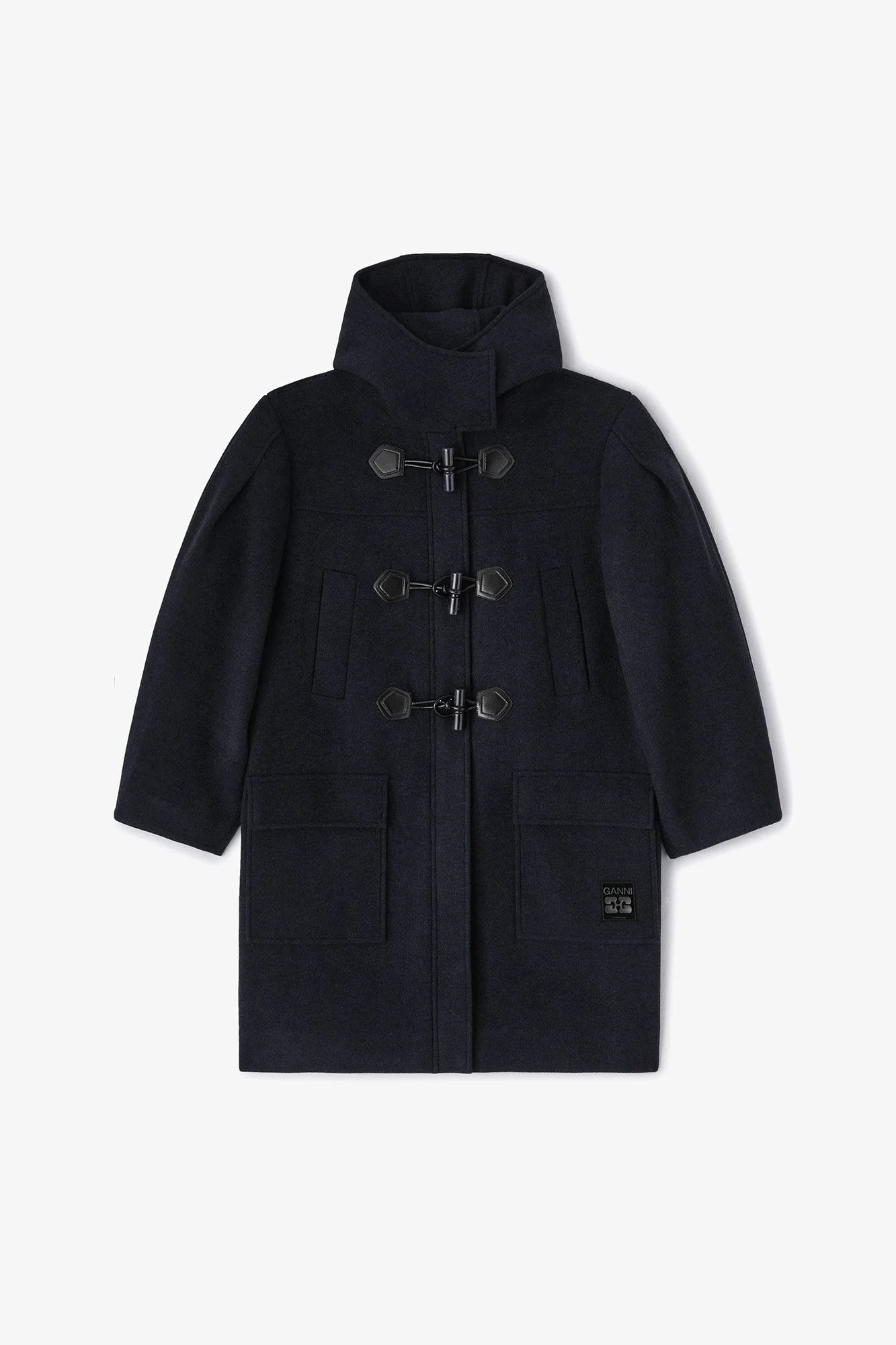 This coat features a high collar, a hood, button-and-loop, 4 pockets and a GANNI logo patch. DETAILS - 72% Wool, 23% Polyester, 5% Cashmere Learn more about our materials - Lining composition: 57% Acetate, 43% Viscose - High collar - Hood - Curved sleeves - Button-and-loop closure - Concealed zip - 4 pockets - GANNI logo patch Made in: China Product ID: A1010042 SIZE & FIT - Relaxed fit - Yaniris is 5’11” and wears a size US 4