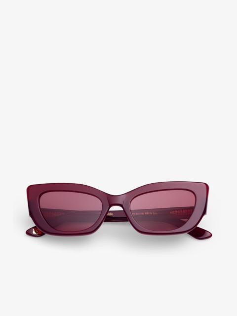 Get ready for sunnier days with the second instalment of GANNI x Ace & Tate collab. Embrace a futuristic outlook with new frames, directional silhouettes + fresh colourways crafted from materials that push the boundaries. Exclusively made using recycled acetate and Renew Bio Acetate. The latest innovative alternative in the eyewear industry to traditional acetate is made from sustainably sourced wood pulp combined with bio-plasticiser instead of fossil fuels. These Sadie Sunglasses are designed in a rectangular cat-eye shape and feature a black frame, tone-in-tone lenses, logo detailing on the temples and middle endpieces. DETAILS - 42% cellulose, 28% certified recycled content (achieved via mass balance approach), 30% bio plasticiser. Learn more about our materials - Maximum UV protection - Black frame - Tone-in-tone lenses - Logo detailing on the temples - Middle endpieces - Comes with a leopard cleaning cloth made from 100% RPET - The sunglasses will be packaged in a 100% RPET leopard pouch and a packaging box made from 70% sugarcane and 30% FSC paper pulp with an FSC paper wrapping around it Made in: China Product ID: A6037 SIZE & FIT - Designed in a rectangular cat-eye shape - Frame dimensions: 5.3 cm x 2.0 cm x 14.5 cm / 2.09 inches x 0.79 inch x 5.71 inches