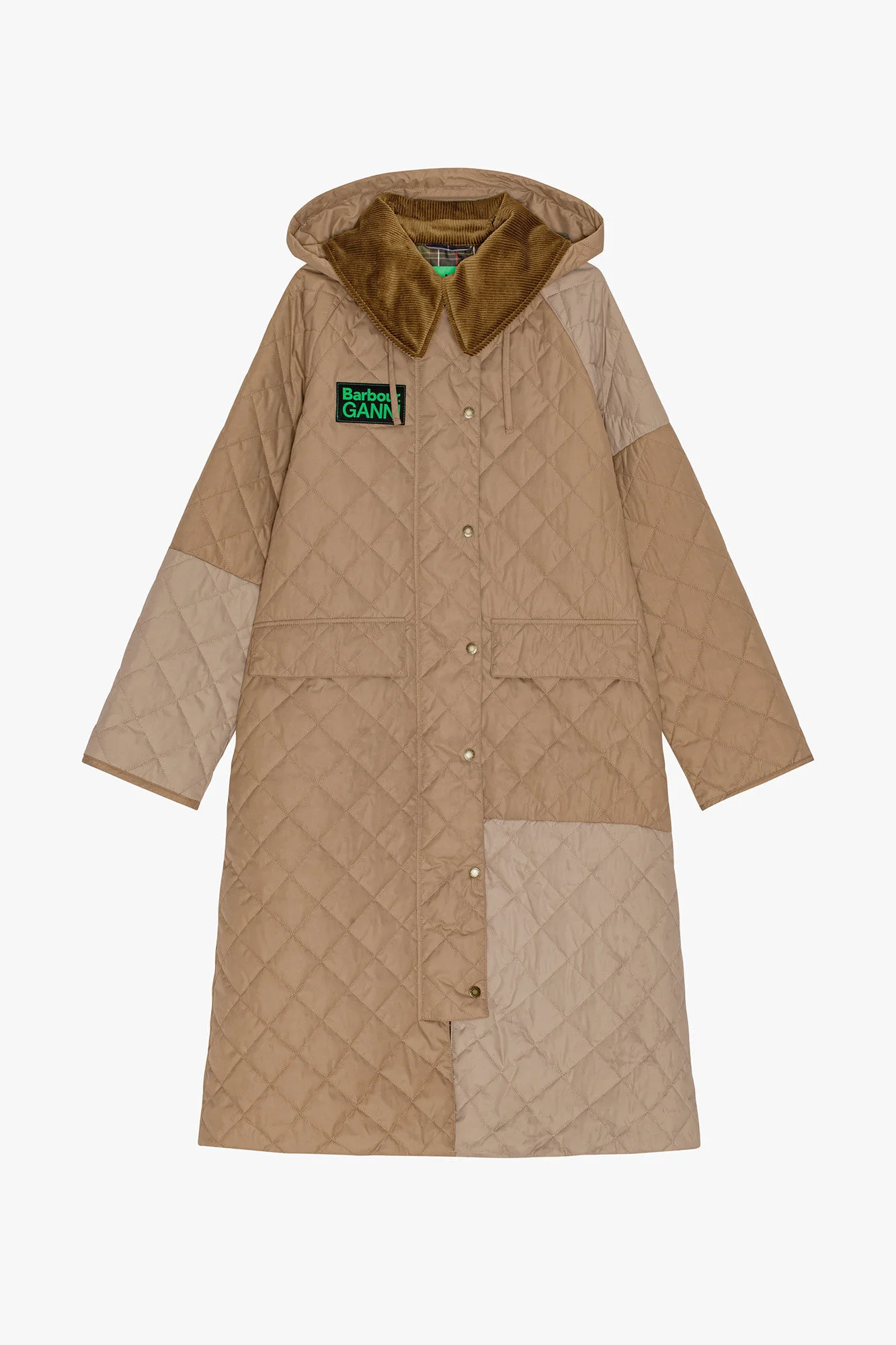 GANNI x Barbour returns. We've rejoined forces with the iconic British brand for another playful spin on the heritage label's classic wax jackets. A timeless celebration of craftsmanship, tradition, and durability, GANNI x Barbour brings together the best of both worlds, connecting old-school British heritage with Scandi 2.0 and a shared dedication to responsibility. This GANNI x Barbour Burghley Quilted Jacket is made from polyester and designed for a relaxed fit with a longer length design for a trench-inspired feel. The jacket features an exaggerated cord collar, concealed zip closure, snap buttons, lower welt pockets, patchwork finish, back stud placket fastening and a green rubber GANNI x Barbour logo badge at the front. DETAILS - 100% recycled polyester - Inner: 100% polyester - Filling: 100% polyester - Collar: 100% cotton - Exaggerated cord collar - Concealed zip closure - Snap buttons - Lower welt pockets - Patchwork finish - Back stud placket fastening - Green rubber GANNI x Barbour logo badge at the front Made in: Vietnam Product ID: F8820 SIZE & FIT - Designed for a relaxed fit - Mediumweight, quilted fabric - Take your normal size to achieve the model's look, those in between sizes or with a smaller frame might consider taking a size down - Please be aware that our size chart aligns with regular GANNI sizing. Please note your GANNI x Barbour product will arrive with Barbour size tag on your product - Zoey is 5’10” and wears a size US 4