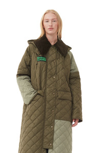 GANNI x Barbour returns. We've rejoined forces with the iconic British brand for another playful spin on the heritage label's classic wax jackets. A timeless celebration of craftsmanship, tradition, and durability, GANNI x Barbour brings together the best of both worlds, connecting old-school British heritage with Scandi 2.0 and a shared dedication to responsibility. This GANNI x Barbour Burghley Quilted Jacket is made from polyester and designed for a relaxed fit with a longer length design for a trench-inspired feel. The jacket features an exaggerated cord collar, concealed zip closure, snap buttons, lower welt pockets, patchwork finish, back stud placket fastening and a green rubber GANNI x Barbour logo badge at the front. DETAILS - 100% recycled polyester - Inner: 100% polyester - Filling: 100% polyester - Collar: 100% cotton - Exaggerated cord collar - Concealed zip closure - Snap buttons - Lower welt pockets - Patchwork finish - Back stud placket fastening - Green rubber GANNI x Barbour logo badge at the front Made in: Vietnam Product ID: F8821 SIZE & FIT - Designed for a relaxed fit - Mediumweight, quilted fabric - Take your normal size to achieve the model's look, those in between sizes or with a smaller frame might consider taking a size down - Please be aware that our size chart aligns with regular GANNI sizing. Please note your GANNI x Barbour product will arrive with Barbour size tag on your product - Zoey is 5’10” and wears a size US 4