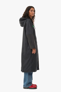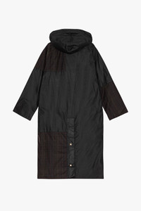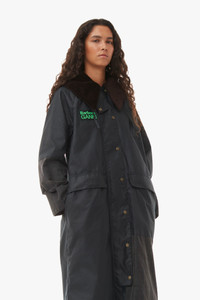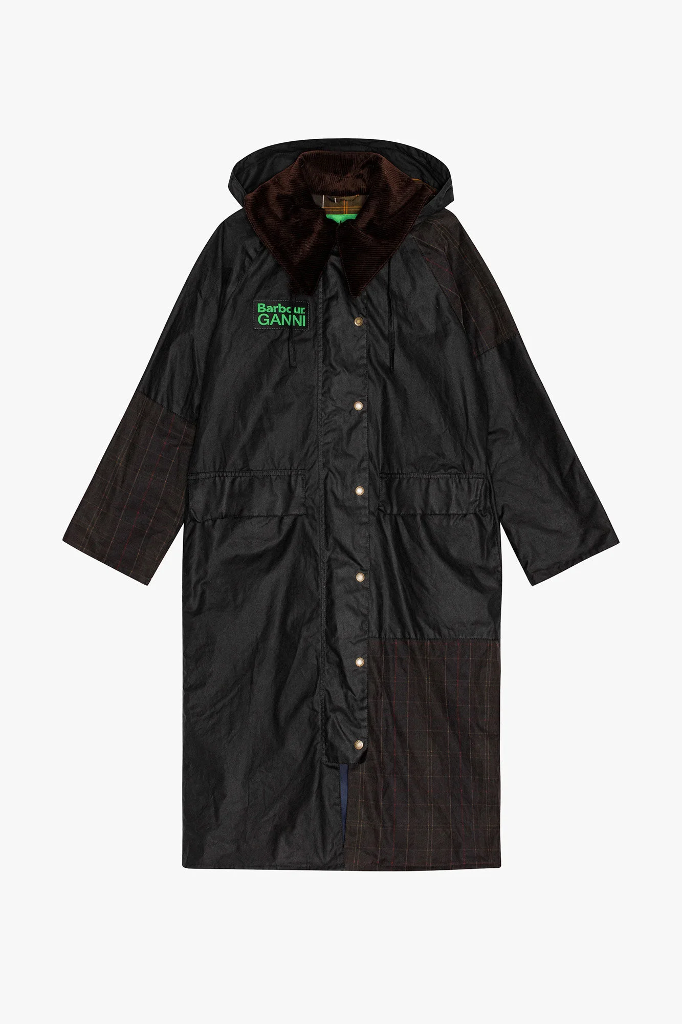 GANNI x Barbour returns. We've rejoined forces with the iconic British brand for another playful spin on the heritage label's classic wax jackets. A timeless celebration of craftsmanship, tradition, and durability, GANNI x Barbour brings together the best of both worlds, connecting old-school British heritage with Scandi 2.0 and a shared dedication to responsibility. This GANNI x Barbour Burghley Jacket is made from waxed cotton and designed in a relaxed fit with a longer length design for a trench-inspired feel. The jacket features a detachable hood with a drawcord detail, exaggerated cord collar, concealed zip closure, snap buttons, lower welt pockets, patchwork finish, back stud placket fastening and a green rubber GANNI x Barbour logo badge at the front. Roll up the cuffs to showcase Barbour's classic tartan lining. DETAILS - 100% organic cotton - Secondary fabric: 100% waxed cotton - Inner: 65% polyester, 35% cotton - Collar: 100% cotton - Sleeve lining/facings: 100% cotton - Dripstrip: 100% polyester - Detachable hood with a drawcord detail - Exaggerated cord collar - Concealed zip closure - Snap buttons - Lower welt pockets - Patchwork finish - Back stud placket fastening - Green rubber GANNI x Barbour logo badge at the front Made in: Moldova Product ID: F8815 SIZE & FIT - Designed for a relaxed fit - Heavyweight, non-stretchy fabric - Weather-resistant - Take your normal size to achieve the model's look, those in between sizes or with a smaller frame might consider taking a size down - Please be aware that our size chart aligns with regular GANNI sizing. Please note your GANNI x Barbour product will arrive with Barbour size tag on your product - A WAX FOR LIFE GANNI x Barbour jacket is built for years of fun + adventure. Barbour's Wax for Life program ensures its longevity with re-waxing and repairs. Barbour recommends rewaxing your jacket every year. Discover more at Barbour.com - Zoey is 5’10” and wears a size US 4