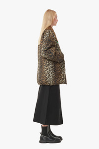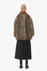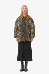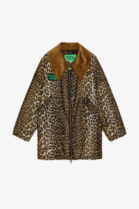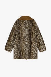 GANNI x Barbour returns. We've rejoined forces with the iconic British brand for another playful spin on the heritage label's classic wax jackets. A timeless celebration of craftsmanship, tradition, and durability, GANNI x Barbour brings together the best of both worlds, connecting old-school British heritage with Scandi 2.0 and a shared dedication to responsibility. This GANNI x Barbour Leopard Bomber Jacket is made from cotton and designed for an oversized fit with a bomber jacket-inspired look. The jacket features an exaggerated cord collar, dropped shoulders, heavy zip closure, front pockets, an elasticated hem, a leopard print and a green GANNI x Barbour rubber logo at the front. DETAILS - 100% organic cotton - Inner: 65% polyester, 35% cotton - Collar: 100% cotton - Sleeve lining: 100% cotton - Trim: 83% cotton, 15% polyester, 2% elastane - Filling: 100% polyester - Exaggerated cord collar - Dropped shoulders - Heavy zip closure - Front pockets - Elasticated hem - Leopard print - Green rubber GANNI x Barbour logo badge at the front Made in: Moldova Product ID: F8823 SIZE & FIT - Designed for an oversized fit, cut to be worn very loose - Take your normal size to achieve the model's look, those in between sizes or with a smaller frame might consider taking a size down for a less oversized look - Please be aware that our size chart aligns with regular GANNI sizing. Please note your GANNI x Barbour product will arrive with Barbour size tag on your product - Mediumweight - Zoey is 5’10” and wears a size US 4