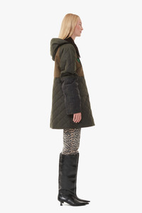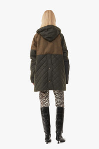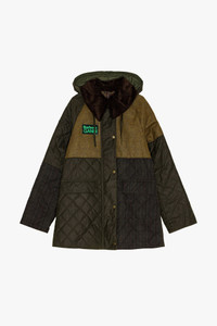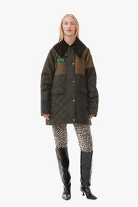 GANNI x Barbour returns. We've rejoined forces with the iconic British brand for another playful spin on the heritage label's classic wax jackets. A timeless celebration of craftsmanship, tradition, and durability, GANNI x Barbour brings together the best of both worlds, connecting old-school British heritage with Scandi 2.0 and a shared dedication to responsibility. This GANNI x Barbour Short Burghley Quilted Wax Jacket is made from waxed cotton and designed for a relaxed fit with a slightly A-line silhouette. The jacket features a detachable hood with a drawcord detail, exaggerated cord collar, snap buttons, lower welt pockets, patchwork finish, back stud placket fastening and a green rubber GANNI x Barbour logo badge at the front. DETAILS - 100% organic cotton - Secondary fabric: 100% wool - Printed fabric: 100% waxed cotton - Filling: 100% polyester - Lining: 65% polyester, 35% cotton - Sleeve lining: 100% cotton - Collar: 100% cotton - Trim: 100% polyester - Detachable hood with a drawcord detail - Exaggerated cord collar - Snap buttons - Lower welt pockets - Patchwork finish - Back stud placket fastening - Green rubber GANNI x Barbour logo badge at the front Made in: Moldova Product ID: F8818 SIZE & FIT - Designed for a relaxed fit with a slightly A-line silhouette - Heavyweight - Take your normal size to achieve the model's look, those in between sizes or with a smaller frame might consider taking a size down - Please be aware that our size chart aligns with regular GANNI sizing. Please note your GANNI x Barbour product will arrive with Barbour size tag on your product - A WAX FOR LIFE GANNI x Barbour jacket is built for years of fun + adventure. Barbour's Wax for Life program ensures its longevity with re-waxing and repairs. Barbour recommends rewaxing your jacket every year. Discover more at Barbour.com - Zoey is 5’10” and wears a size US 4