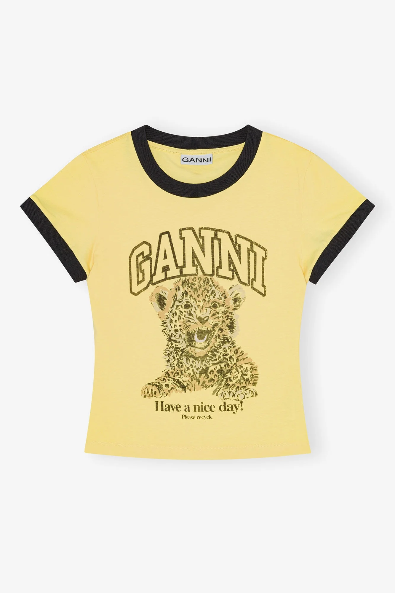 This Yellow Basic Jersey Leopard T-shirt features a round neckline, short sleeves and a GANNI logo. DETAILS - 100% organic cotton. Learn more about our materials - Round neckline - Short sleeves - GANNI logo Made in: Portugal Product ID: T4256 SIZE & FIT - Slim fit - Mariana is 5’10” and wears a size US 4