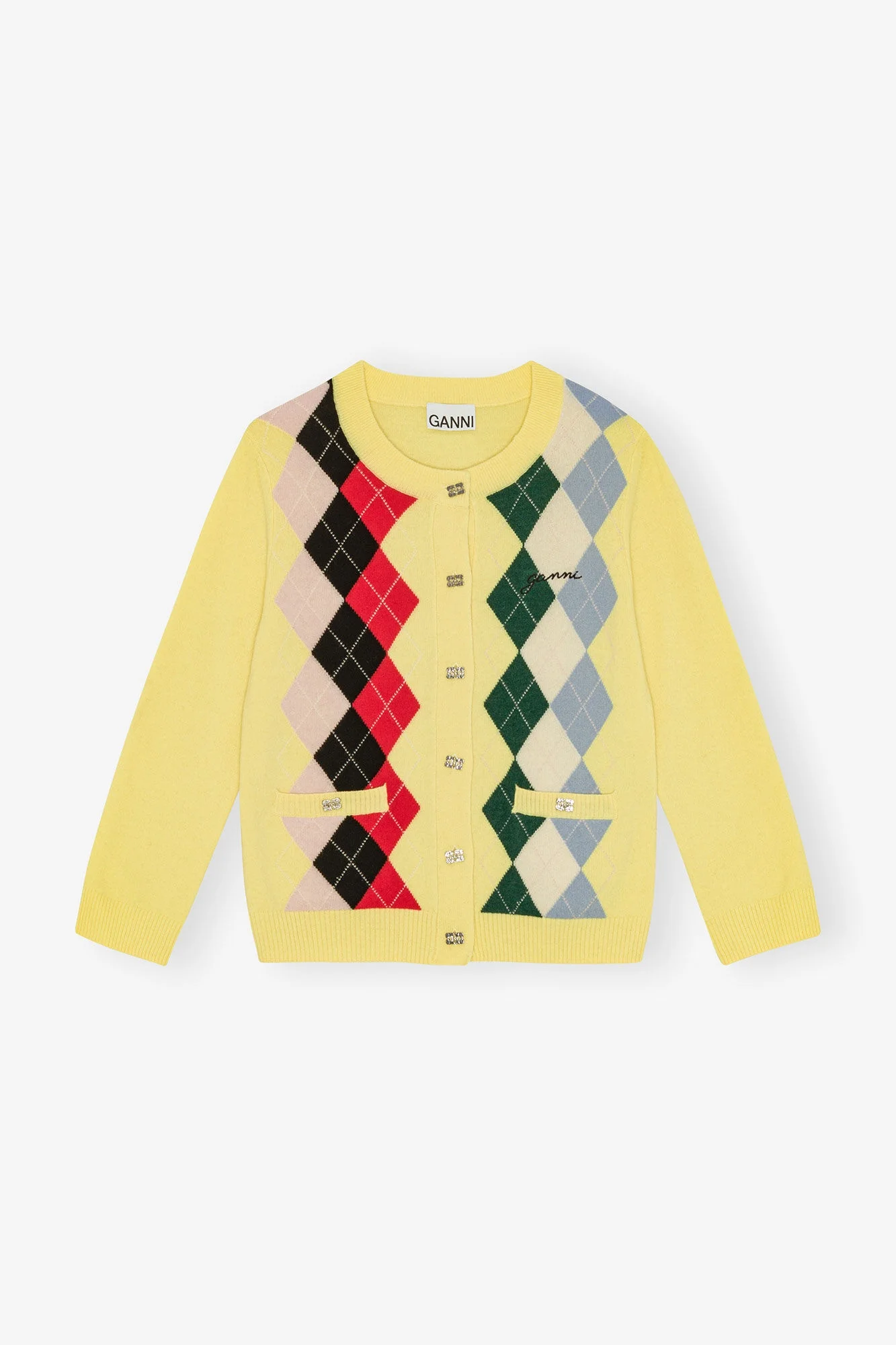 This cardigan features a check pattern in multiple colors. It has a silver-tone button closure, two front pockets and an embroidered GANNI logo. DETAILS - 70% merino wool, 30% cashmere. Learn more about our materials - Round neckline - Long sleeves - Silver-tone button closure - Two front pockets - Ribbed edges - Multi-color check pattern - Embroidered GANNI logo on the front Made in: China Product ID: K2533 SIZE & FIT - Slim fit - Kathia is 5’10” and wears a size S