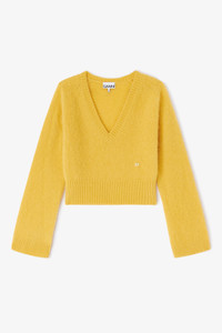 This sweater features a deep v-neckline, long sleeves with rib edges and a GANNI Butterfly logo at the side. DETAILS - 50% Alpaca, 28% Polyamide, 22% Wool Learn more about our materials - Deep V-neckline - Long sleeves - Ribbed edges - Gold-tone GANNI Butterfly logo Made in: Moldova Product ID: A1070076 SIZE & FIT - Relaxed fit - Yaniris is 5’11” and wears a size S