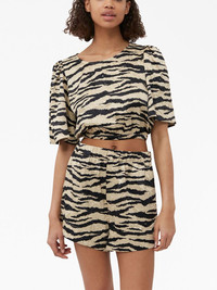 zebra-print crinked shorts The vibrant zebra print of these shorts speaks to GANNI's playful aesthetic. The crinkled finish add to the piece's lively look. Highlights - Beige - Black - Recycled polyester blend - Zebra print - Crinkled finish - High waist - Flared - Thigh-length Imported Composition Recycled Polyester 95%, Elastane 5%