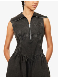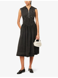 PRODUCT DETAILS - Ganni cotton midi dress - 100% cotton - Zip fastening - Loose fit, Collared, zip front, sleeveless, gathered dropped V-waist, loose skirt, unlined - Machine wash mild - True to size - Size UK 8: length 58in / 122cm - Model is 5ft 10in/1.78m and wears a size UK 8 - Midweight, non-stretch Ref: R04463512