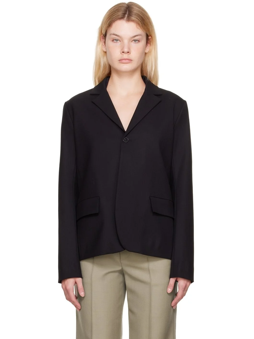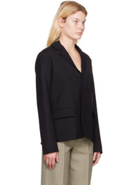 Stretch virgin wool twill blazer. · Notched lapel · Single-button closure · Flap pockets · Vent at side seams · Cutout at back · Full satin lining Supplier color: Black Body: 95% virgin wool, 5% elastane. Lining: 100% viscose. Made in Hungary 222808F057002