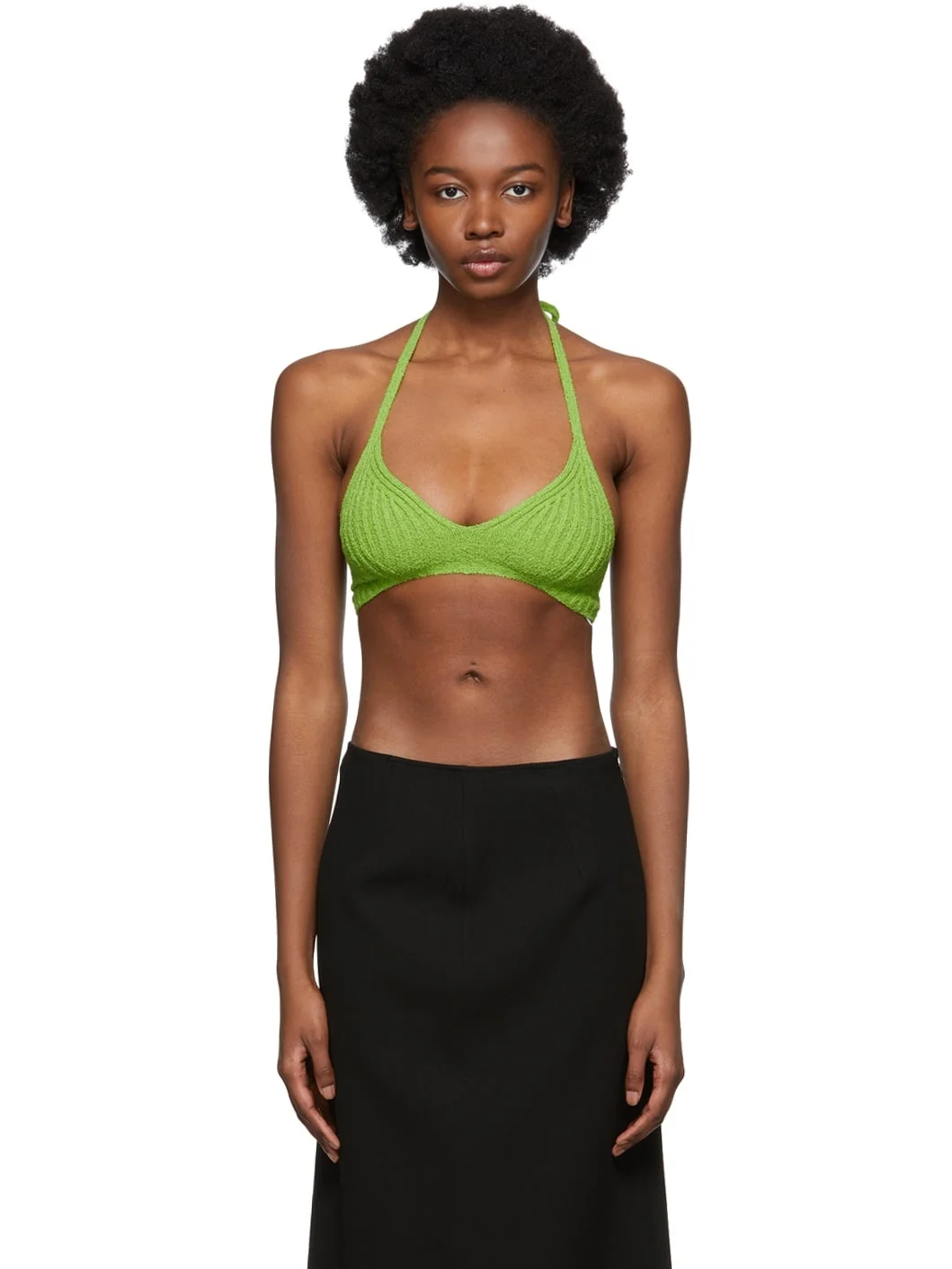 Sleeveless rib knit cotton-blend textured tank top in green featuring self-tie straps at halter neck and back. Supplier color: Bright green 70% cotton, 30% polyamide. Made in Italy 221808F111007