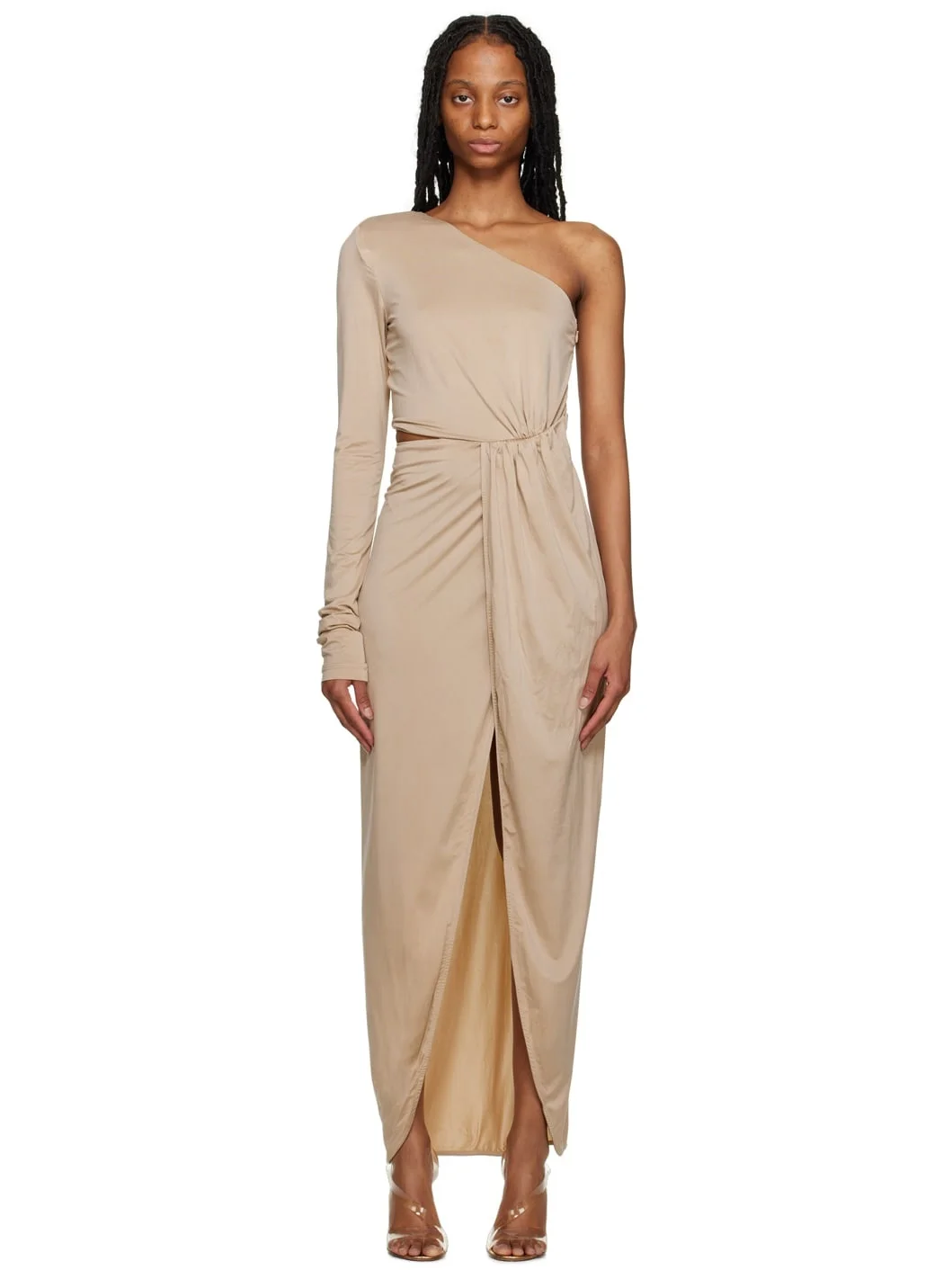 Stretch cupro jersey dress. · Single-shoulder construction · Asymmetric neck · Gathering at elasticized waistband · Slit at front hem · Cutout at side seam · Concealed zip closure at side seam · Padded shoulder · Partially lined Supplier color: Quicksand Body: 90% cupro, 10% elastane. Lining: 92% viscose, 8% elastane. Made in Turkey 231329F055002
