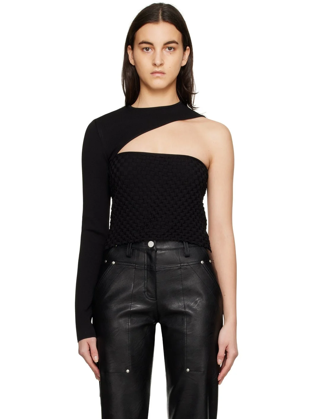 Textured knit rayon-blend sweater. · Single-shoulder construction · Crewneck · Cutout at back Supplier color: Black 65% rayon, 35% polyamide. Made in China 231329F096003