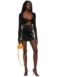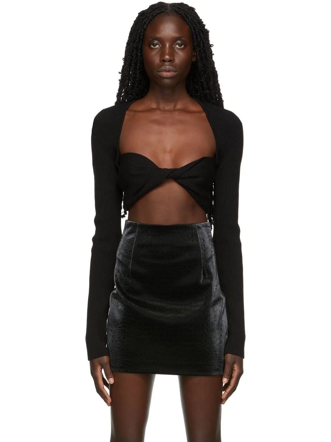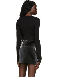 Long sleeve rib knit extrafine merino wool-blend sweater in black. · Sweetheart neckline · Twisted construction at front · Cropped hem Supplier color: Black 87% extrafine merino wool, 13% polyester. Made in Turkey 221329F100010