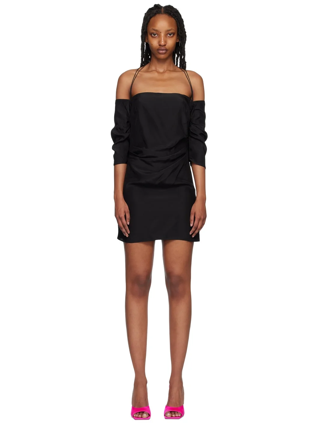 Silk satin dress. Gathering throughout. · Straight neck · Concealed zip closure at side seam · Fixed criss-crossing shoulder straps · Partial satin lining Supplier color: Black Body: 100% silk. Lining: 60% acetate, 40% cupro. Made in Portugal 232329F052011