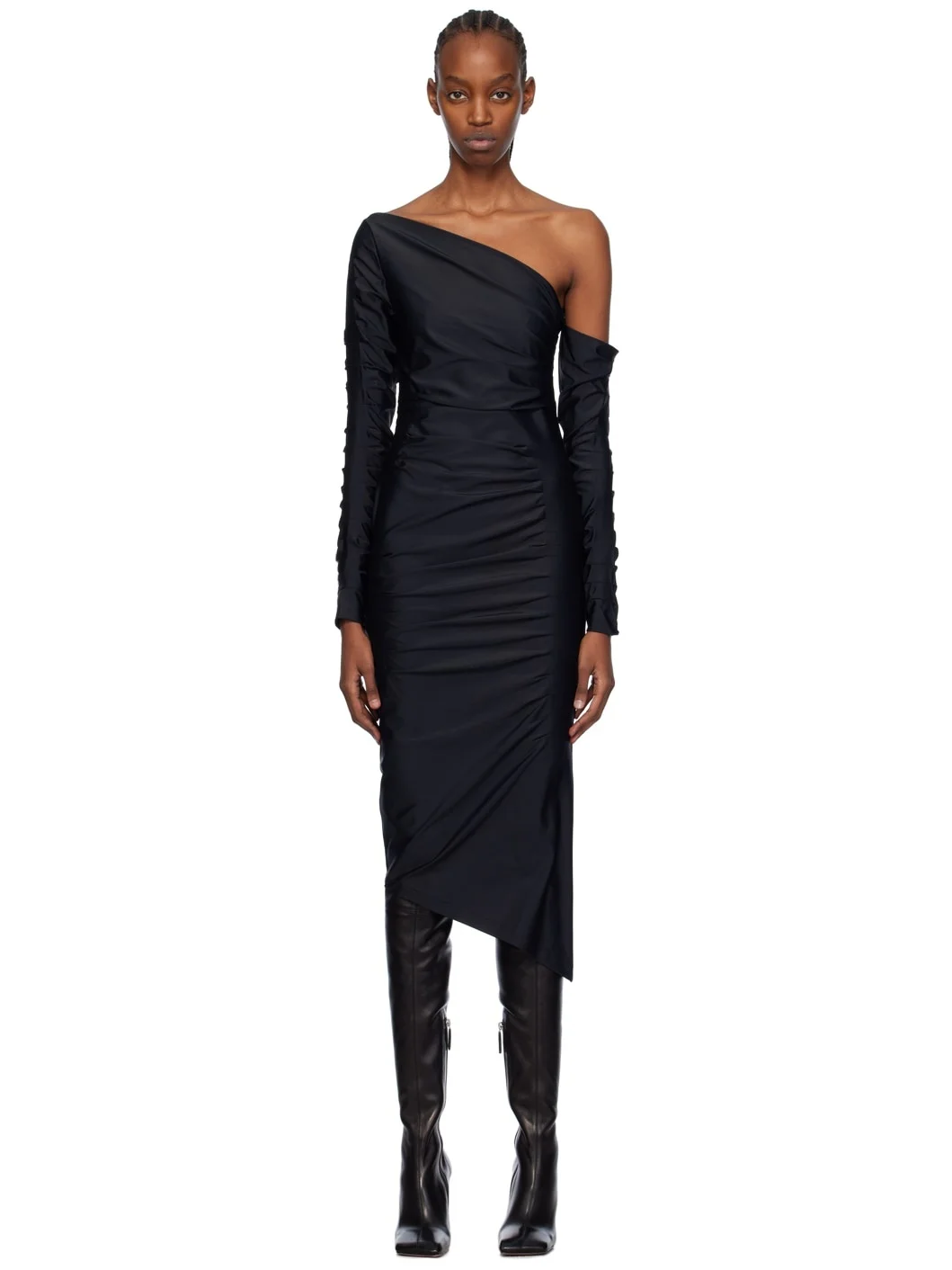 Stretch nylon jersey dress. Pleats throughout. · Single-shoulder construction · Zip closure at side seam Supplier color: Black 78% polyamide, 22% elastane. Made in Macedonia 241329F054010