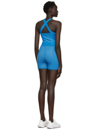 Sleeveless stretch nylon-blend jersey bodysuit featuring graphic pattern in blue and beige. · Paneled construction · Overlock stitching black jersey trim throughout · Crisscrossing straps at low back Supplier color: Electric blue/Sand 52% polyamide, 27% polyester, 21% elastane. Made in India 221329F541005