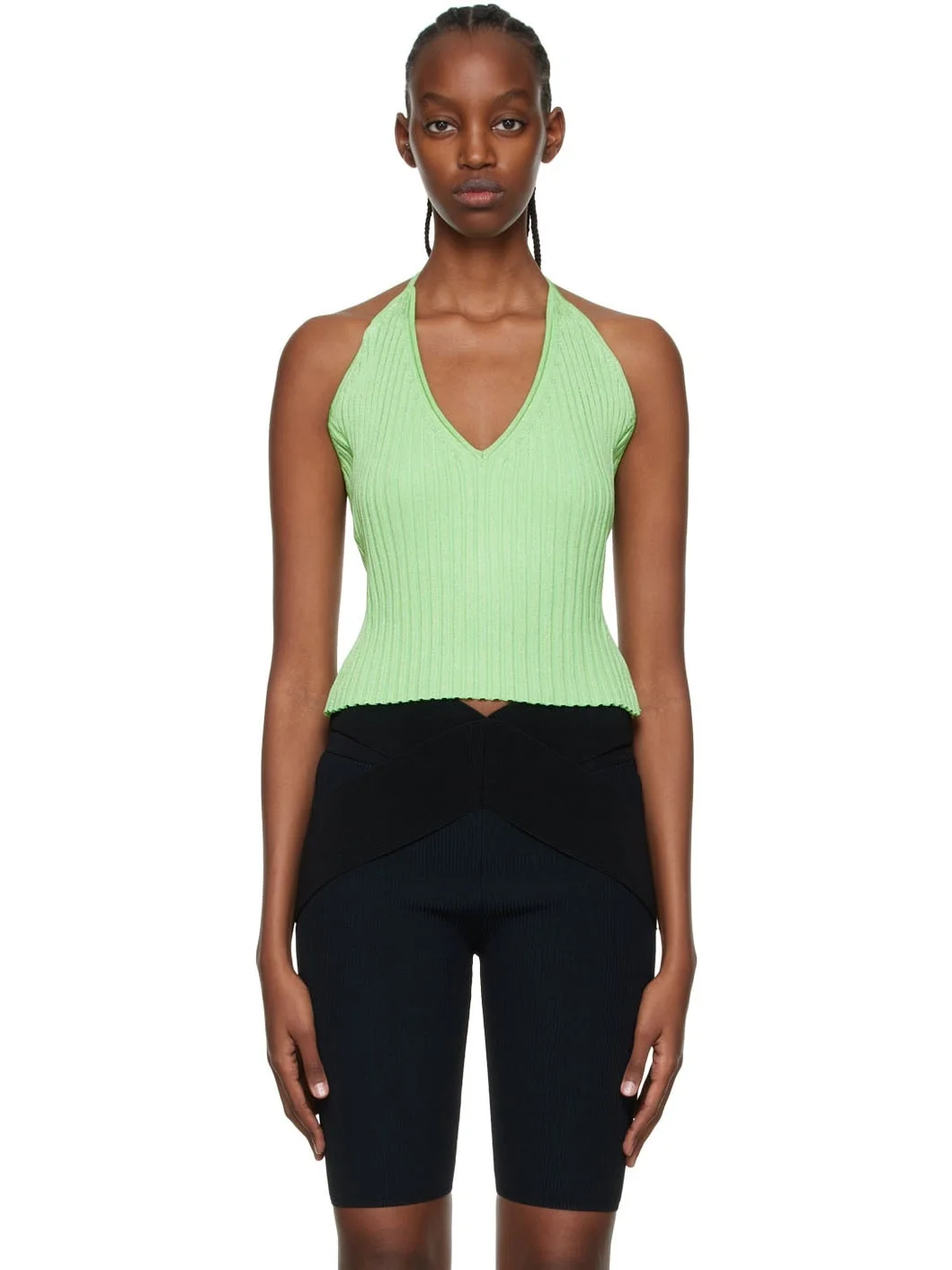 Rib knit rayon and polyester-blend camisole. · Self-tie halter strap · V-neck · Open back Supplier color: Pistachio Body: 83% rayon, 17% polyester. Trim: 100% rayon. Made in Turkey 221329F111016