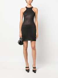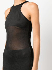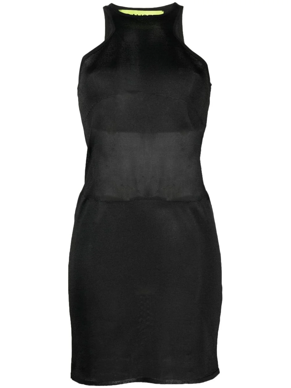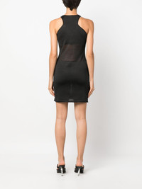 racerback semi-sheer dress Born between Bogota and Amsterdam, GAUGE81 debuts designs that are meant to merge casual and evening wear. Here, a little black dress is elevated with the addition of semi-sheer panels and a racerback. Highlights - Black - Semi-sheer panels - Racerback - Sleeveless - Thigh-length Imported Composition Recycled Polyester 66%, Polyester 34% SIZE & FIT Model measurements Height 5 ft 11 in(1.8 m) Bust/Chest 31.49 in(80 cm) Hips 35.43 in(90 cm) Waist 24.4 in(62 cm) FittingInformation Designed for a close fit throughout Made with a midweight knit, this piece offers some stretch This piece fits true to size – take your usual size Washing instructions Dry Clean Only