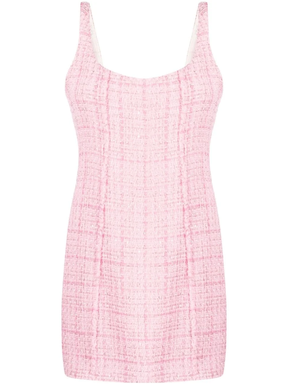 backless tweed minidress Highlights - Light pink - Tweed - Check pattern - Sequin detailing - Backless - Round neck - Sleeveless - Thigh-length - Straight hem Made in Italy Composition Outer: Cotton 44%, Polyester 30%, Acrylic 16%, Polyamide 10% Lining: Viscose 100% SIZE & FIT Model measurements Height 5 ft 10 in(1.78 m) Bust/Chest 31.49 in(80 cm) Hips 36.22 in(92 cm) Waist 25.59 in(65 cm) FittingInformation Designed for a slim fit that sits just away from the body offering a close yet comfortable fit Slightly short in length; consider your own measurements Made from a midweight non-stretch fabric This piece fits true to size – take your usual size Washing instructions Dry Clean Only