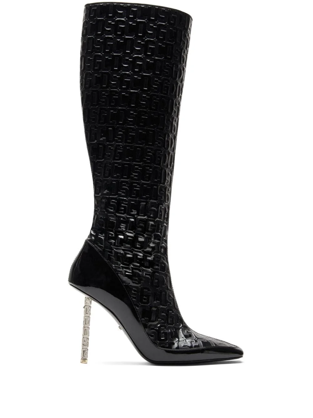 100mm monogram-pattern leather boots Highlights - Black - Calf leather - Patent finish - Monogram pattern - Side zip fastening - Tonal stitching - Square toe - 100mm logo chain heel - Branded leather insole - Leather sole - Knee-high Made in Italy Composition Outer: CALFSKIN 100%, Cotton 45%, Polyurethane 35%, Polyester 20% Sole: Calf Leather 100% Lining: Calf Leather 100% SIZE & FIT Measurement HEEL 3.93 in(10 cm)