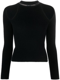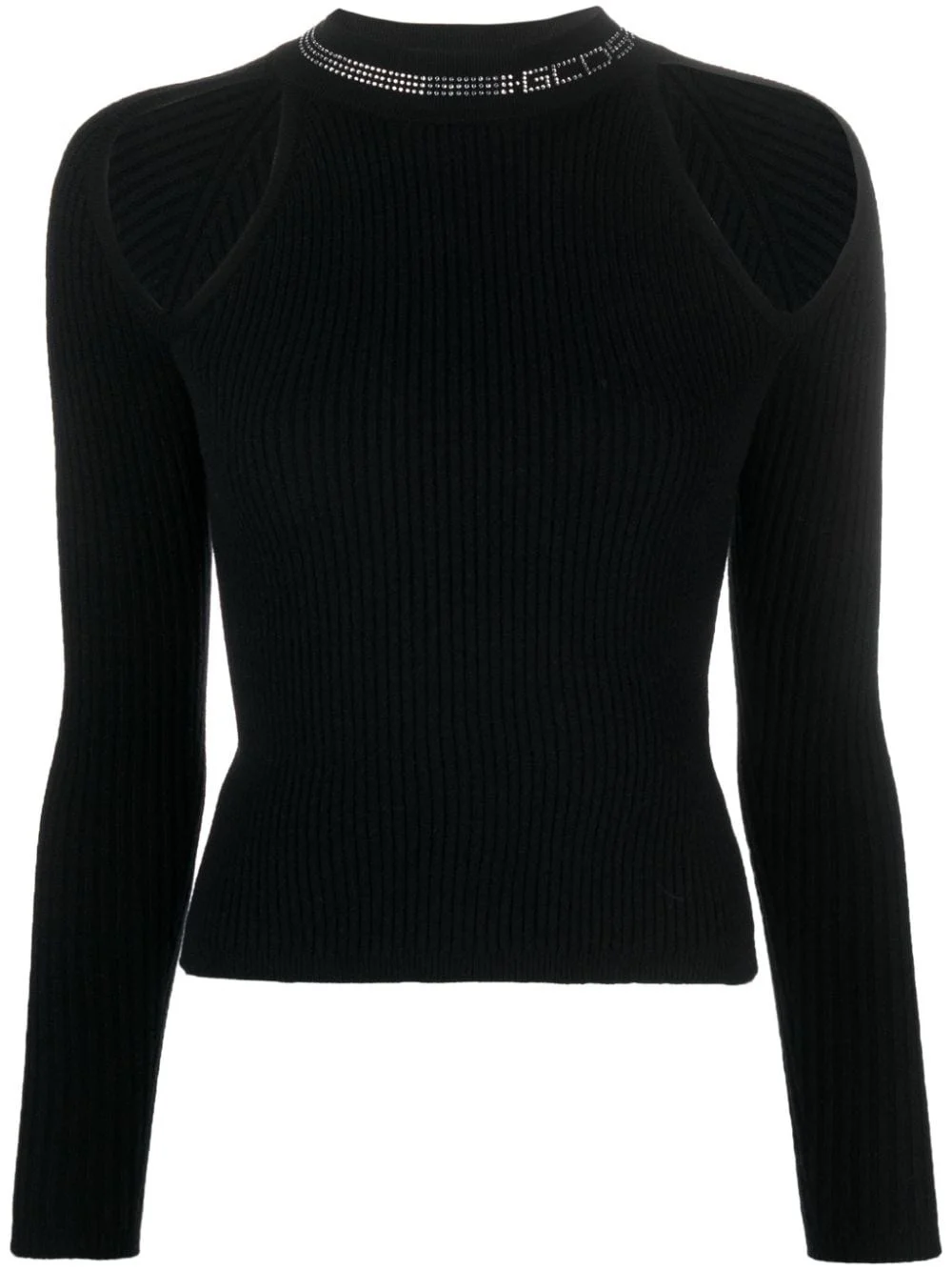 Bling rhinestone-embellished knitted top Highlights - Black - Ribbed knit - Cut-out shoulder detail - High neck - Long sleeves - Embellished neckline Made in Italy Composition Viscose 52%, Polyester 26%, Polyamide 22% SIZE & FIT Model measurements Height 5 ft 10 in(1.78 m) Bust/Chest 30.7 in(78 cm) Hips 36.22 in(92 cm) Waist 25.59 in(65 cm) Washing instructions Machine Wash