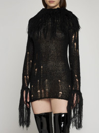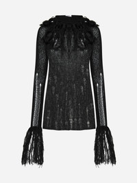 GCDS’ semi-sheer black cotton knit mini dress featuring all-over marks, long fringes at the neckline and cuffs and fitted silhouette. Color: black Size and fit: Model is 183 cm tall and wearing a size S Composition: 99% cotton 1% elastane Country of manifacture: Italy ID designer: AI22W670813-02