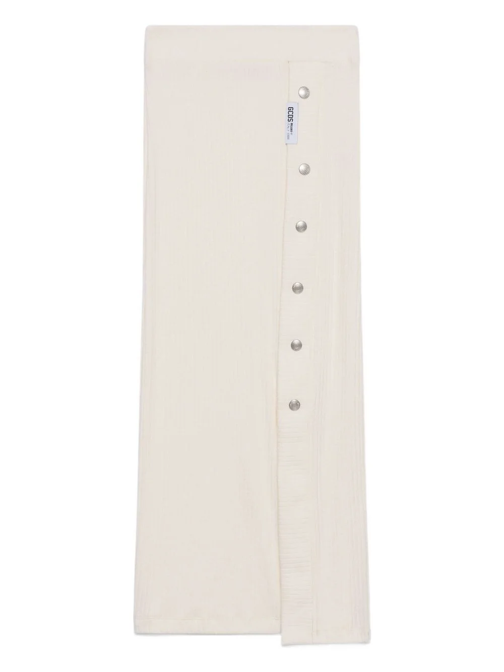 button ribbed skirt Highlights - Bone - Ribbed knit - Side slit - Button detail - Logo patch Made in Italy Composition Viscose 49%, Polyester 25%, Polyamide 21%, Spandex/Elastane 5% Washing instructions Read Manufacturer Guidelines
