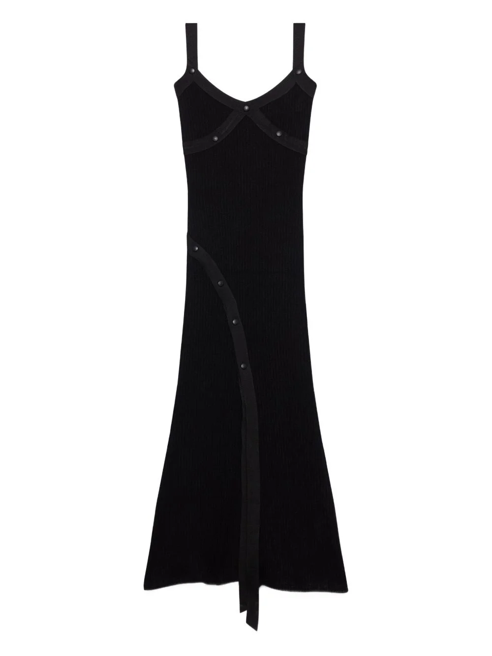 button strap dress Highlights - Black - Strap detail - Button embellishment - V-neck - Open back - Ribbed knit Made in Italy Composition Fabric 100% Washing instructions Read Manufacturer Guidelines