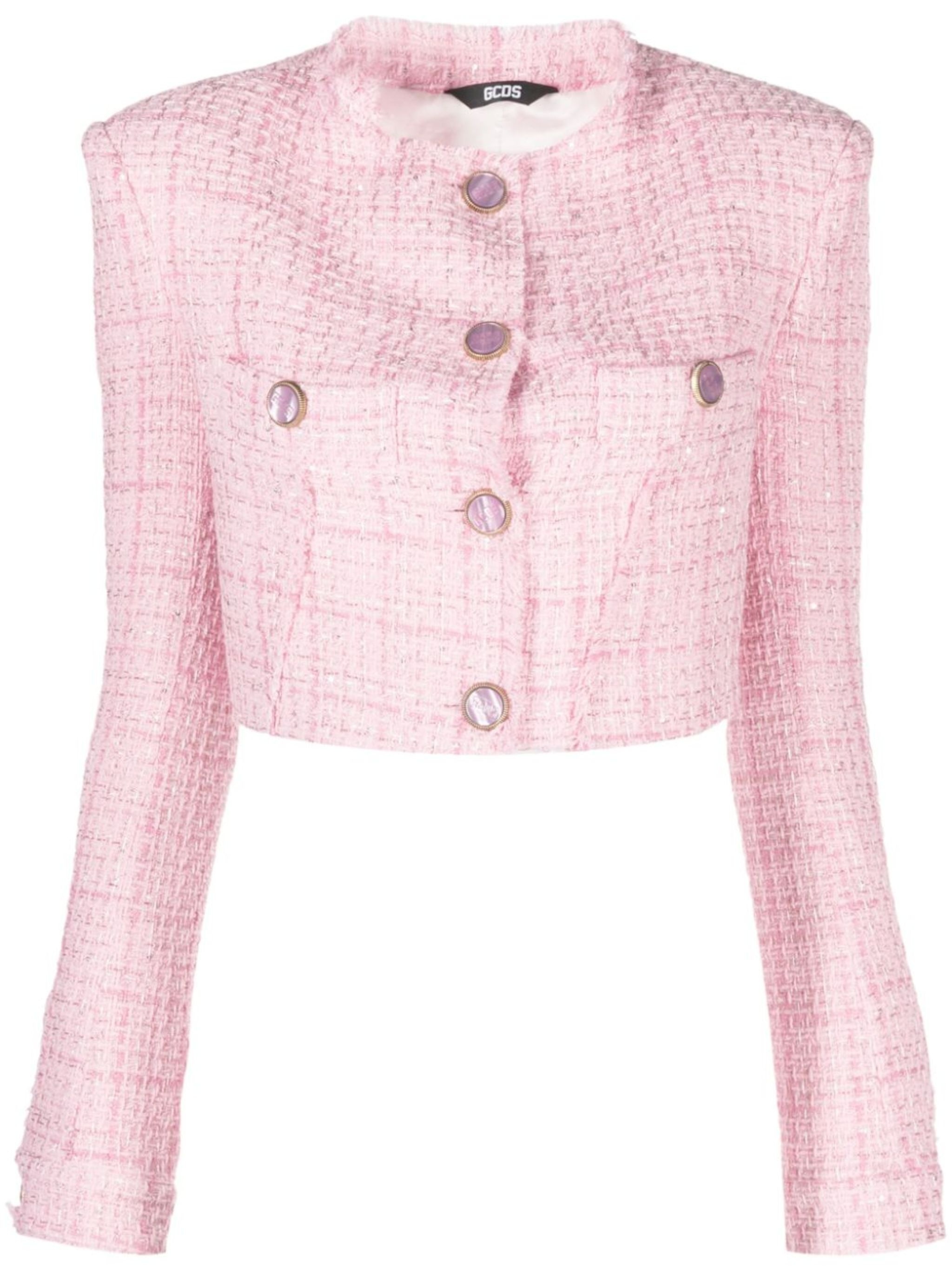 button-up cropped tweed jacket from GCDS featuring light pink, tweed, cropped, round neck, front button fastening, long sleeves, buttoned cuffs, two front welt pockets and straight hem. Size & Fit Model Measurements: Bust: 83cm Height: 178cm Hips: 90cm Waist: 68cm
