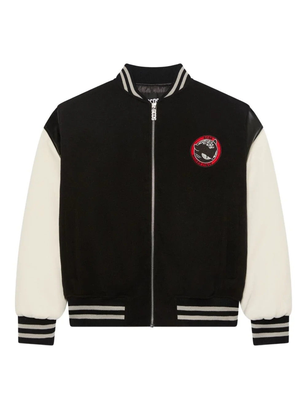 chest-patch bomber jacket Highlights - Black - Round logo patch - Striped ribbed trims - Long sleeves - Front zip fastening Imported Composition Polyester 100% Washing instructions Read Manufacturer Guidelines